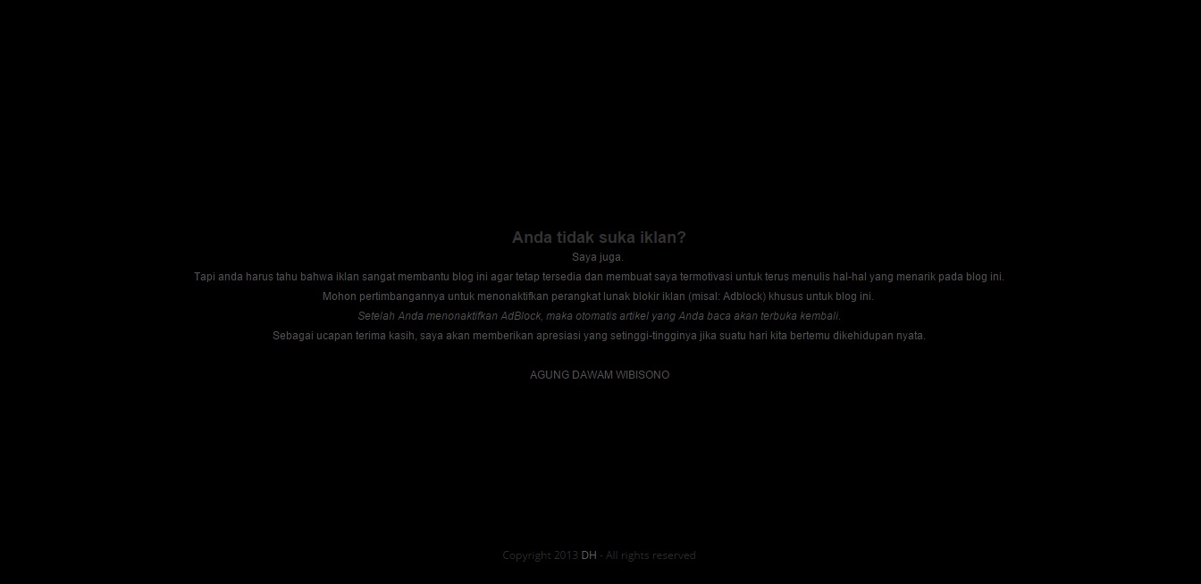 - Secara otomatis dalam jeda waktu tertentu halaman blog akan ditutup dengan sebuah halaman jQuery Anti Adblock dengan warna latar hitam pekat dan berisi informasi untuk berinteraksi dengan para pengunung