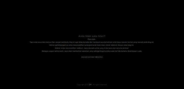 Nah jika pengunjung tetap tidak mengerti rasa terima kasih untuk pemilik blog, ada cara lain untuk blogger mengatasi masalah tersebut dengan memasang Anti AdBlock pada blog Anda. Dengan cara ini pengunjung yang memasang ekstesi AdBlock pada browser mereka akan otomatis tertutup dengan muncul peringatan yang mengahurskan pengunjung mematikan ekstensi adblock jika ingin melanjut menjelajah situs tersebut