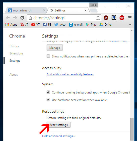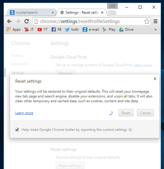 - Klik tombol "Reset settings" di bagian paling bawah.