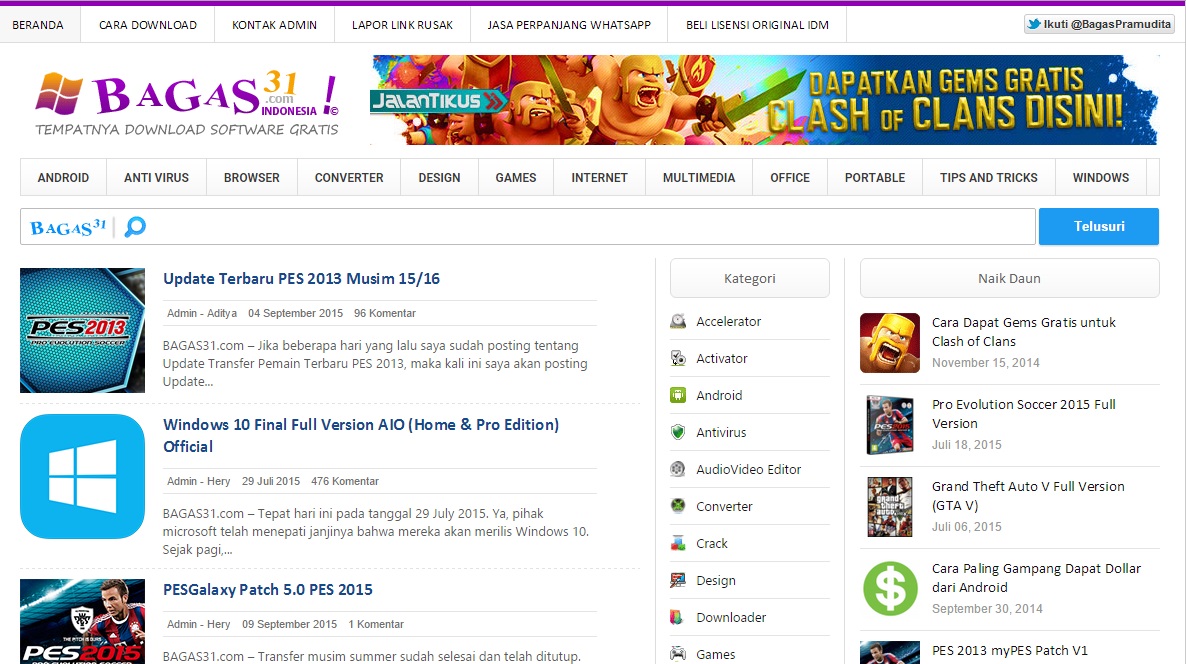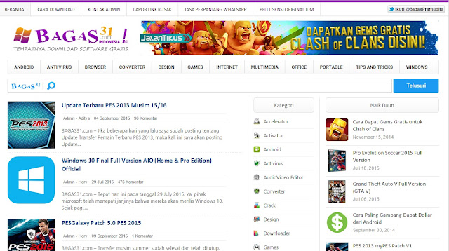 Siapa yang tidak kenal dengan bloger yang satu ini ?? jika maniak games dan aplikasi pasti kalian mengenal blog ini, berbagai aplikasi dan software di google maka bagas31 adalah pemenangnya. Blog ini menyajikan banyak sekali kumpulan aplikasi dan tentunya bisa di download dengan dengan gratis.