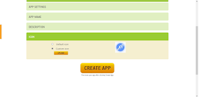 7. pilih icon, disini ada dua pilihan mau icon default dari Appgeyeser atau upload icon blog kalian sendiri, kemudian Klick Create App